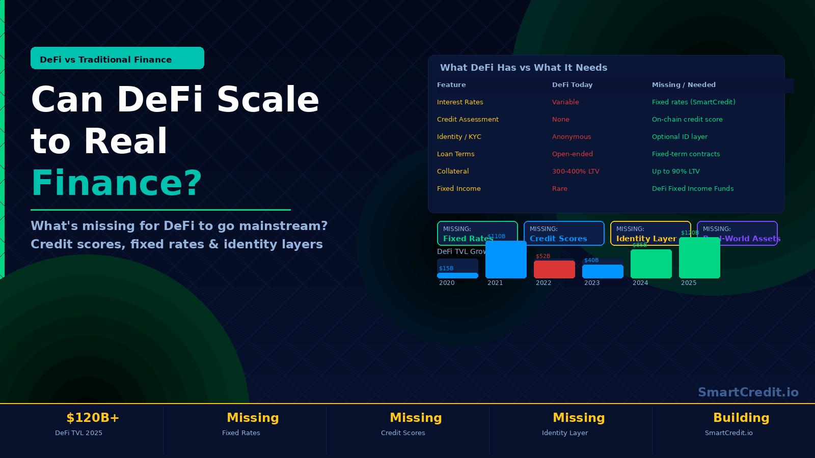 The traditional Fixed Income market is 5–10 times bigger than the global equity market, yet in crypto, fixed income is 5–10 times smaller. SmartCredit.io addresses this with fixed-rate, fixed-term, peer-to-peer DeFi lending.